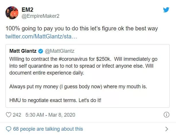 آماده ام در ازای 250 هزار دلار، خودم را به ویروس کرونا مبتلا کنم. بلافاصله برای گسترش ندادن آن، خود را قرنطینه می کنم و تجربه ام را به صورت روزانه، مستندسازی خواهم کرد. همیشه ترجیح می دهم به جای نشستن و حرف زدن، از پول برای بهتر کردن شرایط استفاده کنم. آماده مذاکره برای تعیین مفاد اصلی معامله هستم. بیایید انجامش دهیم.