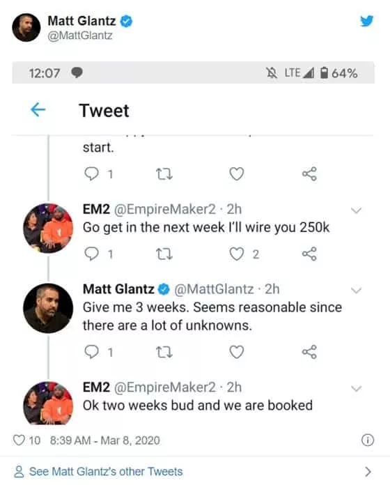با وجود این، بعد از چندین توئیت رد و بدل شده، دو نفر در خصوص مدت زمان مورد نیاز برای ابتلا و تست مثبت کرونا از سوی گلانتس به توافق نرسیدند. استیونسون پیشنهاد یک هفته داد که گلانتس گفت 3 هفته می خواهد. استیونسون پیشنهادش را به 2 هفته ارتقا داد، ولی گلانتس همچنان روی حرفش بود: