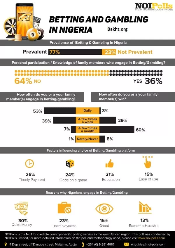 عمده نیجریهایها شرط بندی روی فوتبال را ترجیح میدهند. بیش از 95 درصد کسانی که در این کشور شرط بندی میکنند، مردان هستند. به ندرت زنی در حال شرط بندی دیده شده است. جدا از مغازههای مخصوص شرط بندی در این کشور که رونق خوبی دارند، سایت شرط بندی Bet9ja پلتفرم شماره یک مردم این کشور است که از سال 2013 شروع به کار کرده است. طبق قراردادی با لیگ فوتبال این کشور در سال 2019، آنها اسپانسر لیگ این کشور هم شدند. همینطور اسپانسر چندین تیم در لیگ فوتبال مردان و زنان این کشور هستند. حتی اسپانسر یک سری شوهای تلویزیونی این کشور هم هستند.