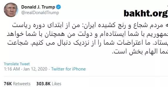 به دنبال سقوط هواپیمای مسافربری اوکراینی و مرگ تعداد زیادی از هموطنان، مردم در تهران و برخی مناطق دیگر دست به اعتراض زدند که این مسئله با حمایت دونالد ترامپ رئیس جمهور آمریکا همراه شد. ترامپ دو توییت فارسی در این خصوص نوشت که توسط مردم ایران به سرعت محبوب شدند.