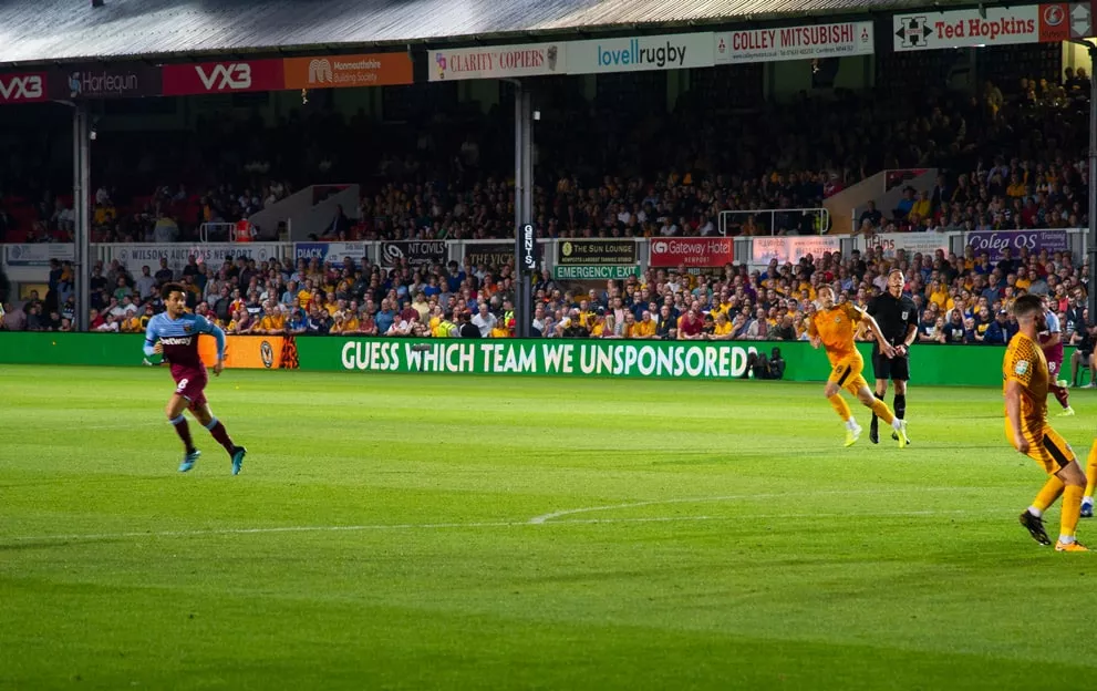 در این کمپین که نام آن “پیراهن ما را نجات بده” است، نیوپورت کانتی یکی دیگر از تیمهای شرکت کننده است. وست هم سه شنبه شب در لیگ کاپ برابر همین تیم به میدان رفت. اتفاقات جالبی روی تابلوهای تبلیغاتی این مسابقه رخ داد. گفتنی است اسپانسر وست هم، یک سایت شرط بندی دیگر بود. پدی پاور بدون استفاده از لوگو یا نام سایت خود، در حالی که از رنگ و فونتها همهچیز مشخص بود، چندین پیام شیطنت آمیز در طول بازی مخابره کرد. برخی از این پیامها، اینها بودند: