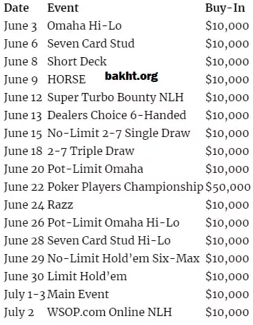 سری جهانی پوکر زمان برگزاری مسابقات سال 2020 را اعلام کرد. این مسابقات در لاس وگاس، در ژوئن و جولای برگزار خواهد شد. تا این لحظه 12 ایونت اصلی برگزاری مسابقات و میزان مبلغ ورودی آنها اطلاع رسانی شده که در ادامه با آنها آشنا میشویم.