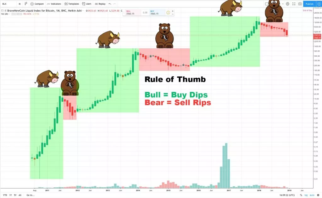 مهمترین مؤلفه ای که بر اساس آن می توان تشخیص داد یک بازار خرسی است یا گاوی، روندهای کوتاه مدت یا افزایش و کاهش ارزش قیمت بیت کوین و سهام در بازار نیست. بلکه اینطور بازار در بلندمدت چه رفتاری از خود نشان می دهد یا نشان خواهد داد عامل تعیین کننده در این ماجرا است. تغییرات جزئی در بازارها ممکن است ناشی از اصلاحات بازار در قیمت ها یا رویدادهای مقطعی در آن باشد. نکته مهمی که هر سرمایه گذاری باید از آن آگاه باشد این است که هیچ وقت نمی توان به طور دقیق زمان شروع یا پایان روندهای بازار را تشخیص داد!
