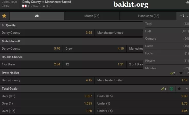 وارد صفحه شرط بندی دربی-یونایتد می‌شویم. گزینه‌ها متنوع هستند و البته دسته بندی نیز وجود دارد. برای مثال 101 آیتم مختلف برای شرط بندی روی وضعیت پایان نیمه اول وجود دارد که در نوع خود جالب توجه است.