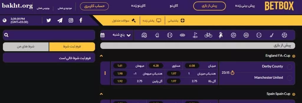 صفحه اصلی بخش پیش بینی ورزشی سایت بت باکس که آن را با اسم “پیش از بازی” در منو میبینید، به این شکل است. نام ورزشها تقویم را میتوانید در بالای صفحه ببینید. آنها صفحه پخش زنده مسابقات نیز دارند. البته این بخش را امتحان کردیم و کار نمیکرد.