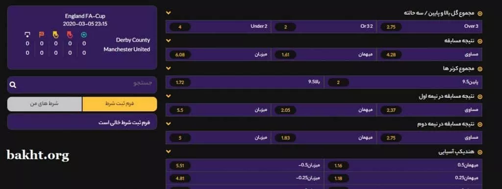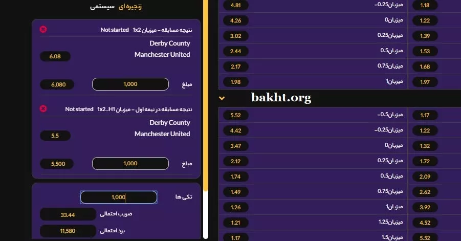 | شرط اور 2 | باخت تمام پول | بازگشت تمام پول | برد با ضریب 1.36 |