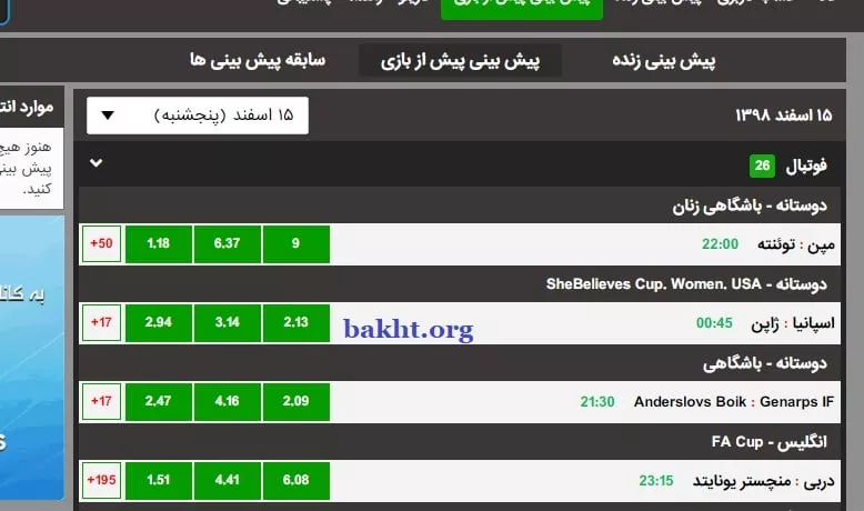 وقتی به قسمت پیش بینی پیش از بازی میروید، اولین مشکلی که با آن روبرو میشوید این است طریقه سورت نامشخص است. در واقع در حالی که انتظار میرود مهمترین بازیها در بالای لیست باشند، یک دیدار دوستانه زنان (بدون اعلام کشورِ دو تیم) در بالای لیست قرار دارد. با این حال گزینههای شرط بندی متنوع هستند. همانطور که میبینید برای دیدار دربی-یونایتد در جام حذفی 195 آیتم در نظر گرفته شده است.