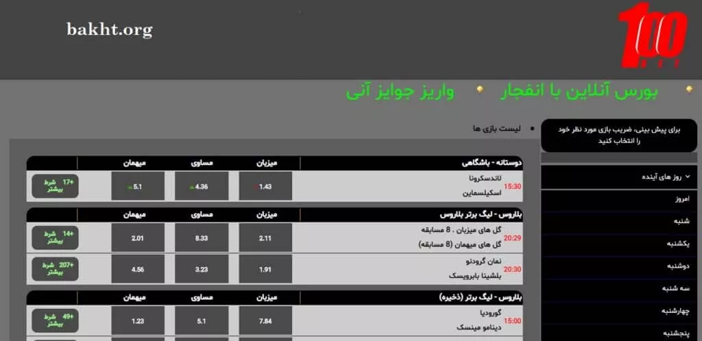 این عکس، صفحه شرط بندی پیش از بازی در 100 بت است. آنها اسکریپت شخصی خود را دارند و مانند سایت دیگری عمل نکردهاند اما تا همینجا باید گفت که تیم گرافیک نسبتا ضعیفی دارند. در صفحه شرط بندی، به جز انتخاب ورزش و روز، آپشن دیگری ندارید.