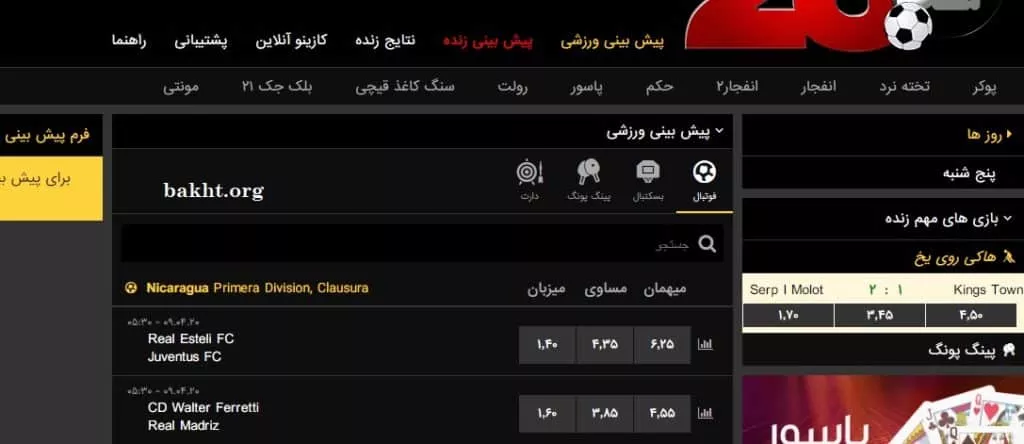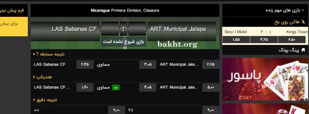 تصویری از صفحه شرط بندی ورزشی 23 بت میبینید. مسابقات لیگ نیکاراگوئه امروز برگزار میشود. امکانات خاصی در این صفحه ندارید. نمیتوانید در این صفحه هرگونه شخصیسازی (تغییر فرم ضرایب، تغییر تم سایت و …) انجام دهید.