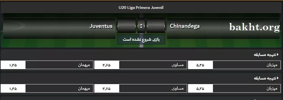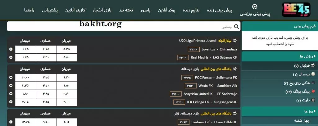 این صفحه شرط بندی ورزشی در سایت بت 45 است. دسته بندی ورزش و روز داریم. شرط بندی روی esports تعریف نشده است. آپشنهایی نظیر ماشینحساب و هرگونه توانایی کاستومایز کردن صفحه را نداریم. ترتیب قرارگیری مسابقات خوب است و مسابقات رسمی نیکاراگوئه، بالاتر از مسابقات دوستانه قرار دارند. برخی سایتهای شرط بندی داخلی همین موضوع را نیز رعایت نمیکنند.