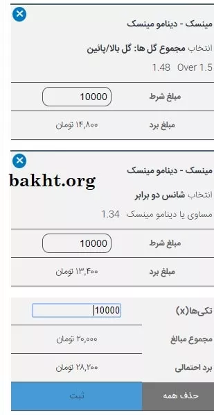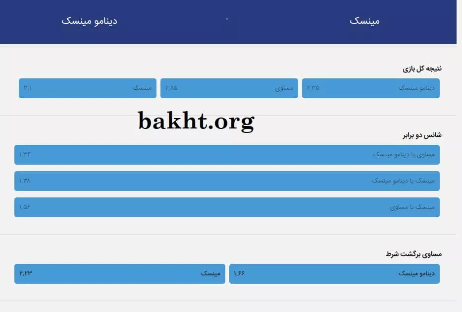 وارد صفحه مهمترین بازی روز مربوط به دو تیم مینسک و دینامو مینسک از لیگ بلاروس شدیم. آیتمهای شرط بندی چیزی حدود 20 مورد هستند که عدد کمی است. خبری از شرط بندی روی تعداد خطا، شرط بندی روی گلزن و … نیست. هیچ توضیحی در مورد وضعیت بازی داده نشده است. ولی جالب توجه است که ضریب شرط بندی برد هر دو تیم بالای 2 است.