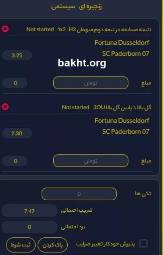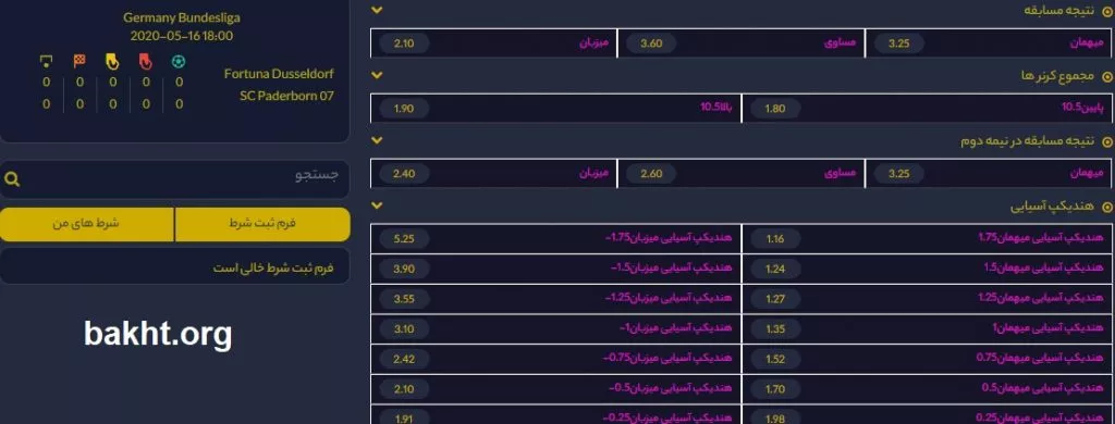 سراغ یکی از مسابقات لیگ آلمان رفتیم. چیزی حدود هشتاد آیتم برای شرط بندی داریم که عدد بدی نیست. آیتمهای خوبی پیش بینی شدهاند و کمبود خاصی حس نمیشود. هانطور که میبینید هر سه آیتم شرط بندی ضریب بالای 2 دارند که جالب است.