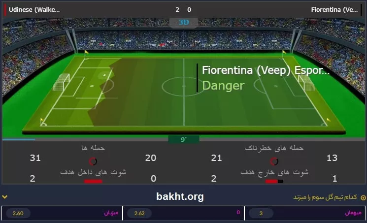 سراغ شرط بندی لایو رفتیم که در حال حاضر به شرط بندی مسابقات esports محدود میشود. گزینههای محدودی برای شرط بندی داریم. از سوی دیگر وضعیت بازی را میتوانیم به صورت 3D مشاهده کنیم که میتواند کمک خوبی باشد.