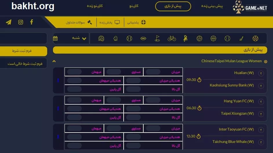 شرط بندی ورزشی در بت بت به این صورت است. برای اینکه مسابقه فوتبالی هم در لیست باشد، زمان را روی شنبه گذاشتیم. در این روز بوندسلیگا از سر گرفته میشود با این حال در بالای صفحه لیگ بانوان تایپه به چشم میخورد که نشان از ایراد در اولویت بندی است. امکان خاصی برای شخصی سازی وجود ندارد.
