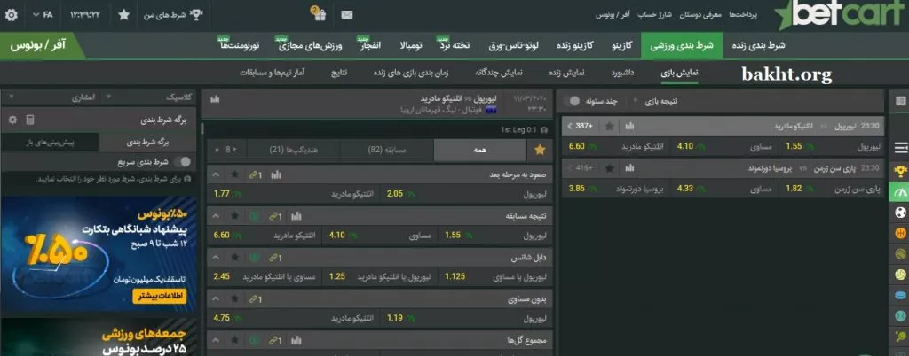 صفحه پایین، شرط بندی لایو در بت کارت است. اطلاعات بازیِ در حال انجام را اینجا میتوانید مشاهده کنید اما این اطلاعات بسیار ابتدایی هستند و جا داشت که اطلاعات بیشتری به کاربر داده شود یا لایو استریم وجود داشته باشد.