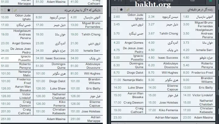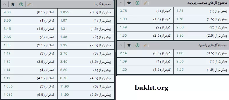 برای مثال در ذیل برخی از گزینههای شرط بندی در بت فوروارد در خصوص دیدار یونایتد و واتفورد را مشاهده میکنید. در این سایت میتوانید در قسمت آندر و اور، از کمتر از نیم گل تا بیشتر از 5.5 گل شرط بندی کنید. همینطور در خصوص دو تیم به صورت مجزا میتوانید روی تعداد گل شرط بندی کنید و از سوی دیگر، شرط بندی روی گلزنان بازی نیز گزینهای جذاب است. زدن دو گل توسط آنتونی مارسیال در این بازی، ضریب 4 دارد.