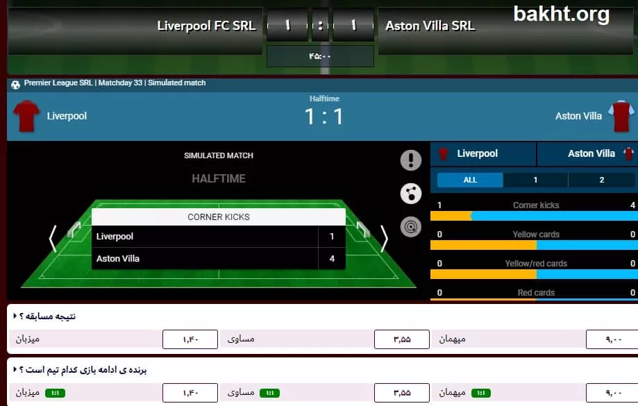 همانطور که مشاهده میکنید، آنها شرط بندی روی شبیه سازی مسابقات لیگ را نیز دارند. برای شرط بندی زنده، یکی از مسابقات لیگ برتر انگلستان را انتخاب کردهایم. در این مسابقه در بین دو نیمه مسابقه لیورپول و استون ویلا هستیم و نتیجه 1-1 است. چیزی حدود 40 آیتم نیز در اینجا دارید.