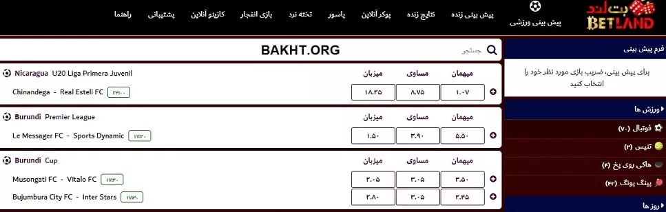این صفحه شرط بند ورزشی در بت لند است. اولیتها کمی مشکل دارد. برای مثال اگرچه لیگ بروندی برگزار میشود، گزینه اول مربوط به جوانان نیکاراگوئه است. امکاناتی جز انتخاب ورزش و روز در این قسمت ندارید. نمیتوانید هرگونه تغییر یا شخصی سازی انجام دهید.