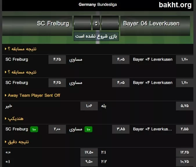 سراغ شرط بندی تک دیدار بوندسلیگا بین فرایبورگ و لورکوزن رفتیم. چیزی حدود صد آیتم برای شرط بندی داریم که عدد بدی نیست. شرط بندی مجموع به 2.5 محدود میشود که جالب نیست. جالب اینکه این آیتم چندین بار تکرار شده است و به طور کل آیتم تکراری کم نیست.