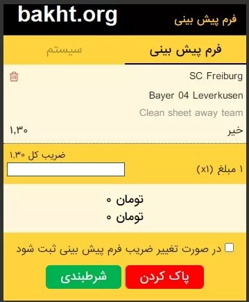 فرم پیش بینی به این صورت است. فرم سادهای داریم. امکان اضافه دو آیتم از یک مسابقه وجود ندارد. نمیتوانید از یک مسابقه میکس شرط بندی بسازید، همینطور نمیتوانید سینگل همزمان داشته باشید.
