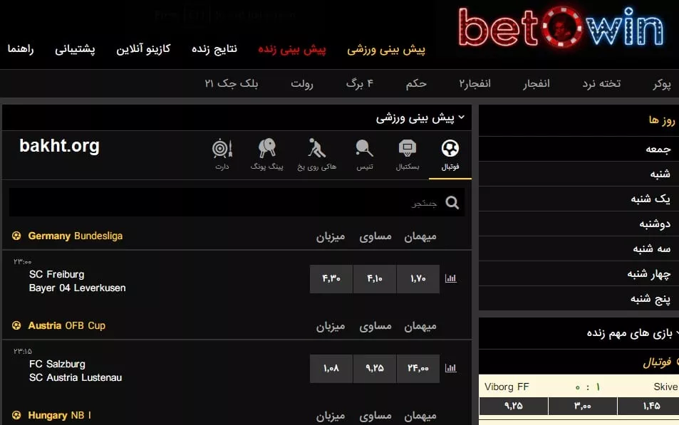 شرط بندی ورزشی در بتووین به این صورت است. یک دیدار از لیگ آلمان تا دقایقی دیگر انجام میشود که بالای لیست قرار دارد. در سمت راست میتوانید روزهای مختلف را انتخاب کنید و در بالای لیست، ورزشهای متفاوت به چشم میخورد. امکان خاصی برای شخصیسازی وجود ندارد.