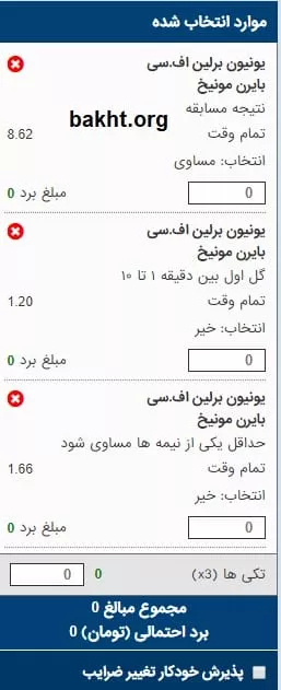 فرم یپش بینی در بت ویکتوری به این صورت است. نمیتوانید آیتمهای متفاوت یک بازی را با هم میکس کنید. با این حال میتوانید چند آیتم را به صورت همزمان، سینگل شرط بندی کنید.