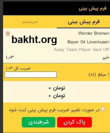فرم پیش بینی، به سادهترین شکل طراحی شده است. اجازه میکس از یک مسابقه را ندارید. حتی نمیتوانید سینگل همزمان از یک مسابقه داشته باشید. به محض اضافه کردن آیتم دوم، مورد اول حذف میشود. گزینه در صورت تغییر ضریب فرم پیش بینی ثبت شود نیز وجود دارد.