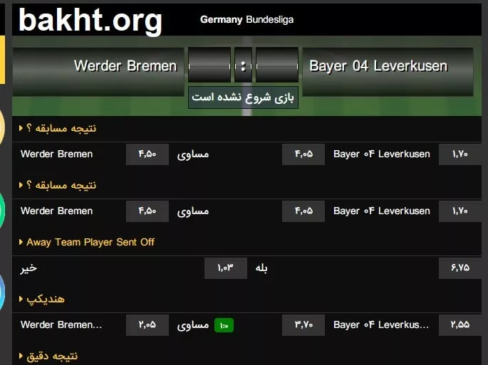 این صفحه شرط بندی یک مسابقه در گرگ بت است. دیدار برمن و لورکوزن که امشب برگزار خواهد شد. چیزی حدود صد آیتم برای شرط بندی داریم که عدد بدی نیست. این بین برخی آیتمها تکراری هستند. شرط بندی مجموع هم به 2.5 محدود شده است.