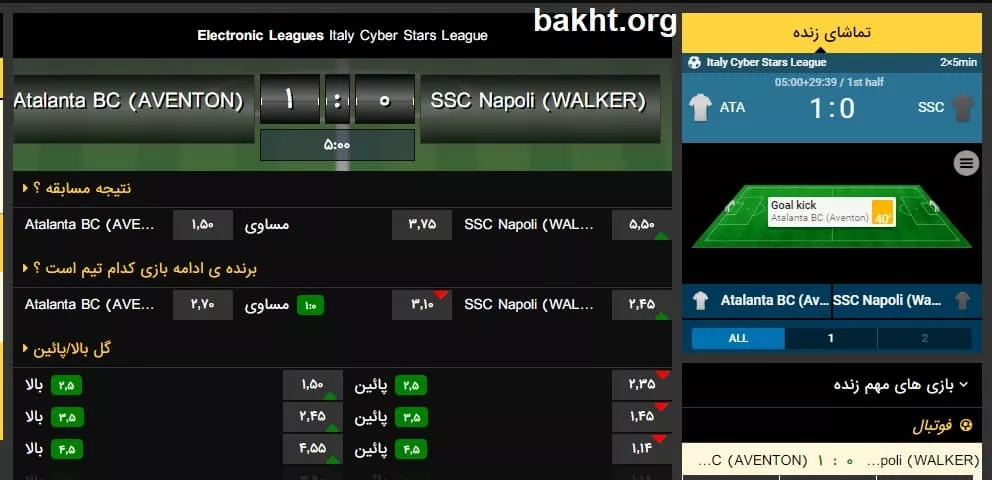 پیش بینی لایو در حال حاضر محدود به لیگ شبیه سازی فوتبال میشود. تعداد آیتمها بیشتر از 3-4 مورد نیست. در سمت راست تماشای زنده مسابقه را داریم که البته به نمایش وضعیت بازی اختصاص دارد و خبری از تماشا نیست.
