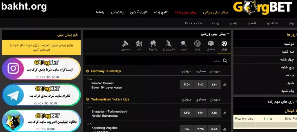 صفحه شرط بندی ورزشی در گرگ بت به این صورت است. امکان انتخاب روز برگزاری مسابقات متفاوت و ورزش مربوط به وجود دارد. جز این امکانی برای شخصی سازی وجود ندارد. همانطور که میبینید امروز مسابقاتی از لیگ آلمان و ترکمنستان برگزار خواهد شد.