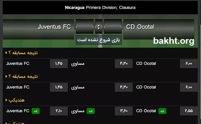 سراغ یکی از مسابقات لیگ نیکاراگوئه رفتیم. این صفحه شرط بندی مسابقهها در های بت است. چیزی حدود 40 آیتم داریم که برخی تکراری است. بسیاری از گزینههای موردنیاز را نداریم و از سوی شرط بندی مجموع به 2.5 محدود شده است.