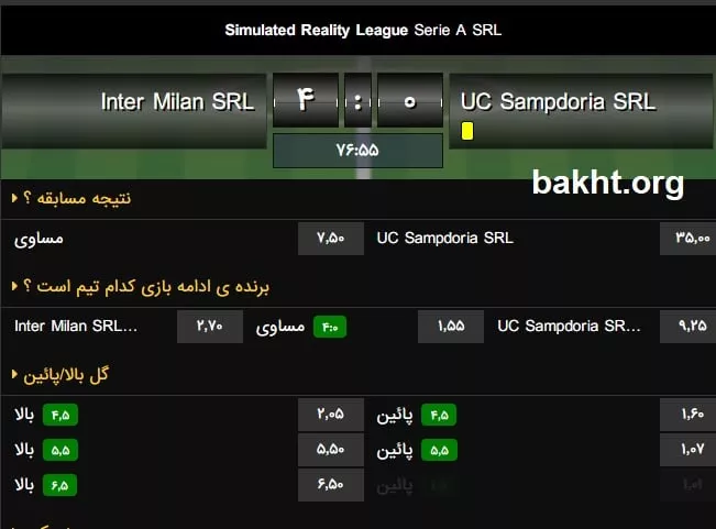برای بررسی شرط بندی زنده سراغ لیگ شبیه سازی فوتبال رفتیم. به جز تعداد گل و کارت زرد، هیچ اطلاعاتی از وضعیت بازی نداریم. تعداد آیتمها هم حدودا ده مورد هستند.