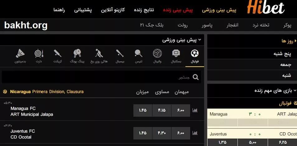 این صفحه شرط بندی ورزشی در های بت است. لیگ نیکاراگوئه که هنوز برگزار میشود در بالای لیست جا دارد. توانایی تغییر روزهای هفته و همینطور ورزشها را دارید. با این حال توانایی هرگونه شخصیسازی را ندارید.