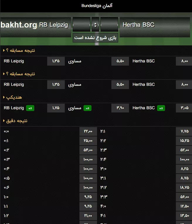 سراغ بازی لایپزیش و هرتا از لیگ آلمان رفتیم. چیزی بین هشتاد تا صد آیتم شرط بندی برای چنین مسابقهای داریم. اطلاعات خاصی در مورد وضعیت بازی وجود ندارد، آنهم با وجود اینکه بازی از چارچوب لیگ برگزار میشود و جدول و مسابقات قبلی مشخص است. شرط بندی مجموع به بالا و پایین 0.5 و 2.5 محدود شده که چیز عجیبی است.