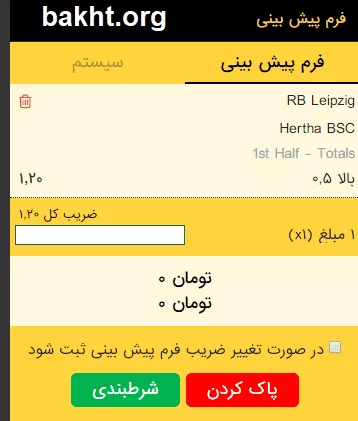 فرم پیش بینی در این سایت، چنین چیزی است. فرم سادهای داریم. اجازه اضافه کردن دو آیتم از یک مسابقه را نداریم. به محض اضافه کردن مورد دوم، مورد اول حذف میشود. این یعنی اجازه ساخت میکس شرط بندی یا شرط بندی سینگل همزمان را نداریم.