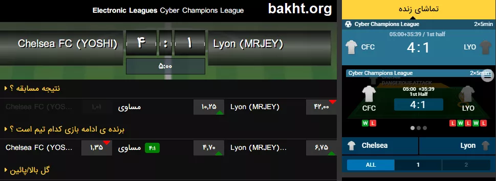 برای شرط بندی لایو سراغ یکی از مسابقات لیگ شبیه سازی فوتبال رفتیم. این بازی از لیگ قهرمانان برگزار میشود. اطلاعات مسابقه را به طور محدود در سمت راست مشاهده میکنید. تنها 4-5 آیتم برای شرط بندی روی این مسابقه داریم.