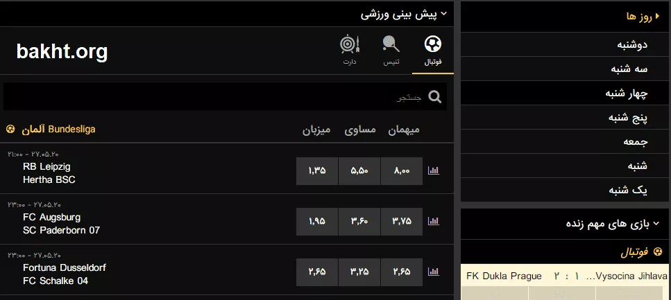 شرط بندی فوتبال در خفن بت به این صورت است. برای اینکه فوتبالی وجود داشته باشد، تاریخ را روی چهارشنبه گذاشتیم. در این روز مسابقات بوندسلیگا برگزار میشود. جز پریدن از روی تاریخ و ورزش، هیچ گونه شخصیسازی در این سایت ممکن نیست.