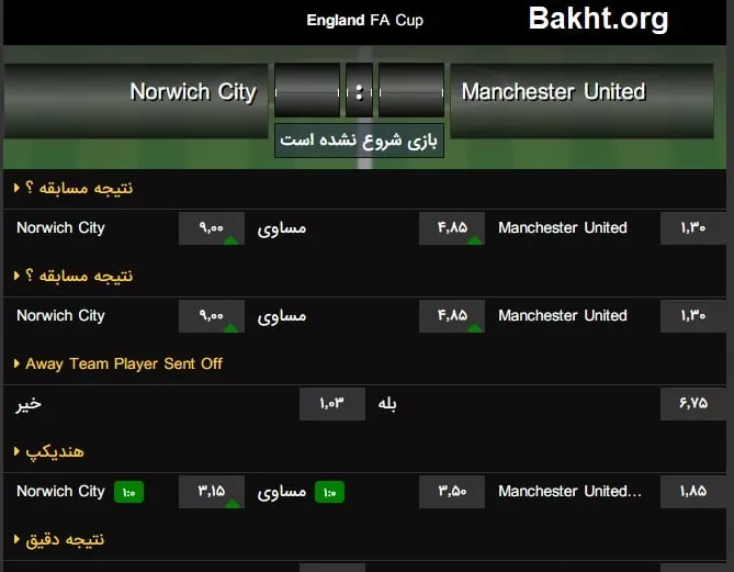 پیش بینی یک مسابقه در مانی بت به این شکل است. دیدار نوریچ-منچستریونایتد را از جام حذفی انگلیس انتخاب کردیم. چیزی حدود صد آیتم برای شرط بندی داریم که عدد متوسطی است. برخی آیتمها این بین تکراری هستند. همینطور شرط بندی مجموع نیز به 2.5 محدود شده و البته سه جای متفاوت لیست آمده است. شرط بندی هندیکپ هم به صورت محدود ارائه شده است.