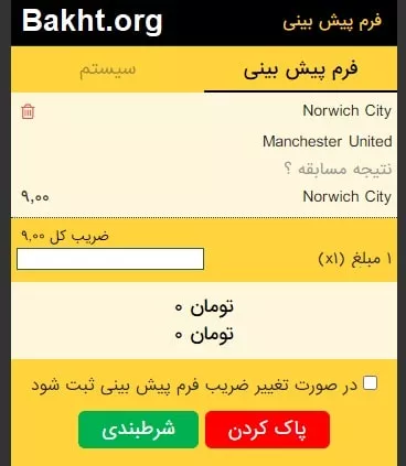 فرم پیش بینی در این سایت، چیزی تا این اندازه ساده است. این بین اجازه ساخت میکس از یک مسابقه را ندارید. این یعنی نمی توانید دو آیتم یا بیشتر از یک مسابقه انتخاب کنید. این مشکل در زمانی که بخواهید شرط سینگل دسته ای ببندید هم نمود پیدا می کند. در این سایت این اجازه را پیدا نخواهید کرد.