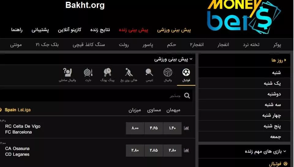 شرط بندی ورزشی اینطور در مانی بت شروع می شود. پیش فرض روی فوتبال قرار دارد اما والیبال، تنیس و چند رشته دیگر نیز قابل شرط بندی هستند. در سمت راست روزهای هفته را داریم. میتوانیم مسابقات فردا را شرط بندی کنیم. جز این، نمیتوانیم هرگونه شخصی سازی انجام دهیم. از نظر اولویت موارد شرط بندی نیز وضعیت درست به نظر میرسد. لیگ اسپانیا در بالای لیست جا گرفته که مهمترین لیگی است که امشب برگزار خواهد شد. پس از آن جام حذفی انگلیس، سوپرلیگ ترکیه و لیگ سوئیس جا گرفتهاند.