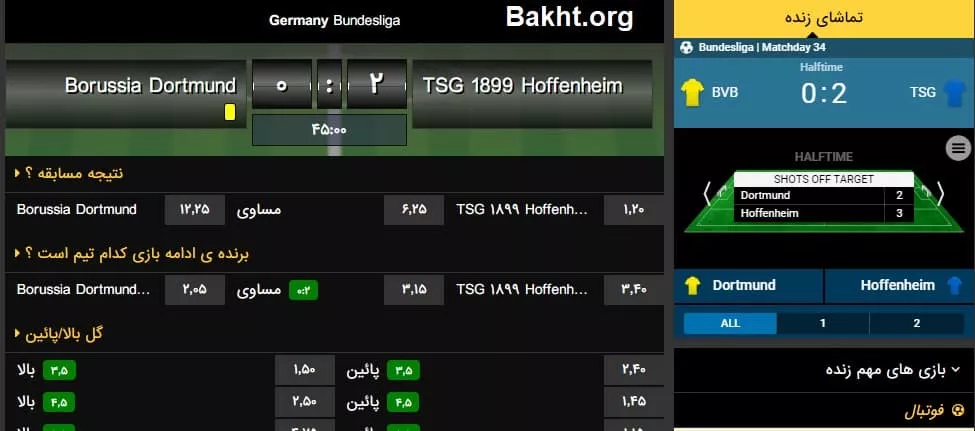 سراغ شرط بندی لایو نیز رفتیم. در این لحظه، بازی دورتموند و هوفنهایم بین دو نیمه است. میزبان این بین 2-0 عقب است. چیزی حدود سی آیتم برای شرط بندی موجود است. همچنان برخی موارد تکراری هستند. خبری از شرط بندی مجموع نیست. در سمت راست نمایی از وضعیت بازی مشاهده می کنید که اطلاعات نسبتا خوبی را منتقل می کند.
