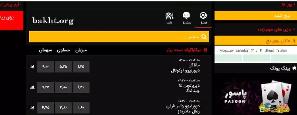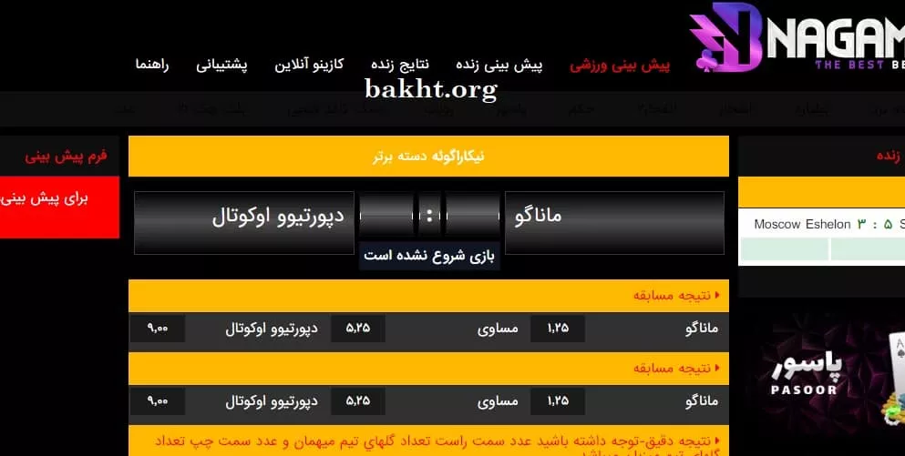 تصویر زیر مربوط به صفحه شرط بندی ورزشی نگم بت است. البته امروز مسابقهای برگزار نمیشد و نتایج را به پنج شنبه محدود کردیم. امکانات خاصی در این صفحه ندارید. هرگونه توانایی برای کاستومایز کردن (تغییر فرم ضرایب، تغییر تم سایت و …) در این صفحه جایی ندارد. مسابقات لیگ نیکاراگوئه که هنوز برگزار میشود، در بالای لیست است.