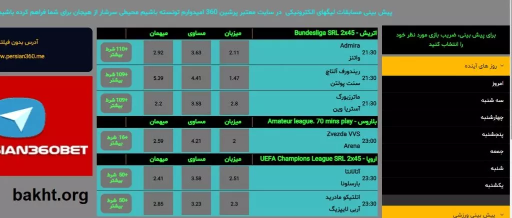 شرط بندی ورزشی در پرشین 360 چنین چیزی است. از رنگهای جالبی استفاده نشده و خیلی زود احساس میکنید که طراح این سایت آدمی بیسلیقه است. در سمت راست روزهای هفته و پایینتر ورزشها را دارید. امکانات دیگری فراهم نیست. اجازه هرگونه شخصیسازی را ندارید.