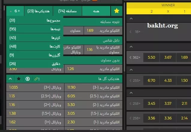 برای انجام شرط بندی اتلتیکومادرید، بازی امشب این تیم برابر ویارئال را پیدا کردیم و تصویر زیر بخشی از آن است. تعداد آپشنهای شرط بندی 74 مورد است که بیشترین تعداد در سایتهای اخیر بررسی شده نیست اما عدد قابل قبولی است. در این سایت نیز منویی در بالای صفحه شرط بندی هر مسابقه دارید که میتوانید به قسمتی که برای شرط بندی در نظر دارید بپرید.