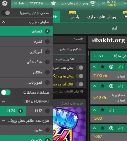 تم پیش فرض پین باهیس حقیقتا چندان جذاب نیست. البته این سایت، گزینههایی متنوع برای افراد خاص پسندتر ارائه داده که همانطور که میبینید، قادر هستید که تم را عوض کنید یا از ضرایب شرط بندی متفاوتی استفاده نمایید. از این نظر، این سایت شبیه به بت فوروارد عمل کرده است.