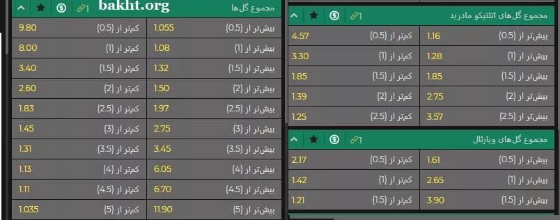 برای مثال گزینههای شرط بندی روی حالت بالا و پایین را مشاهده میکنید. در این سایت برای این بازی قادر به شرط بندی روی کمتر از نیم گل تا بیشتر از 5 گل هستید. اینکه گزینههای بدون نیم، از جمله 5، 4، 3 و غیره را هم این بین میبینیم جالب است. به ندرت سایتی در ایران چنین حالتی را ارائه میدهد. در توضیح باید گفت که اگر روی بیشتر از 5 گل یک مسابقه شرط بندی کنید و تعداد گلها 5 باشد، پول شما بازمیگردد.