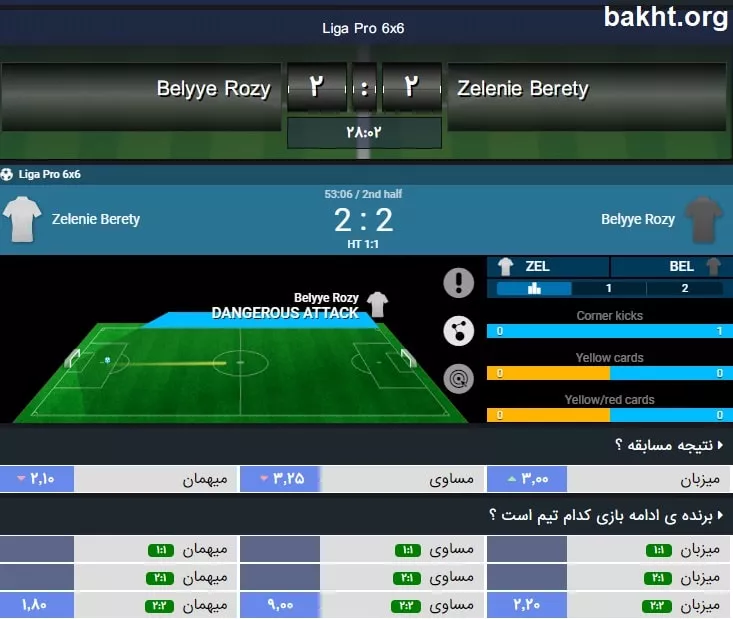 شرط بندی لایو در پوبت به شبیه سازی لیگ فوتبال مجدود میشود. این مورد، مربوط به لیگ روسیه است. چیزی حدود ده آیتم برای شرط بندی داریم. همینطور در پایین نام دو تیم، وضعیت بازی گزارش میشود.