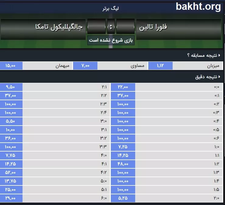 شرط بندی یکی از مسابقات لیگ استونی را انتخاب کردیم. چیزی حدود صد آیتم برای شرط بندی داریم که راضیکننده است. شرط بندی مجموع به پایین و بالای 1.5 و 2.5 محدود شده است. با وجود اینکه بازی از چارچوب لیگ برگزار میشود، اطلاعاتی در باب وضعیت دو تیم وجود ندارد.