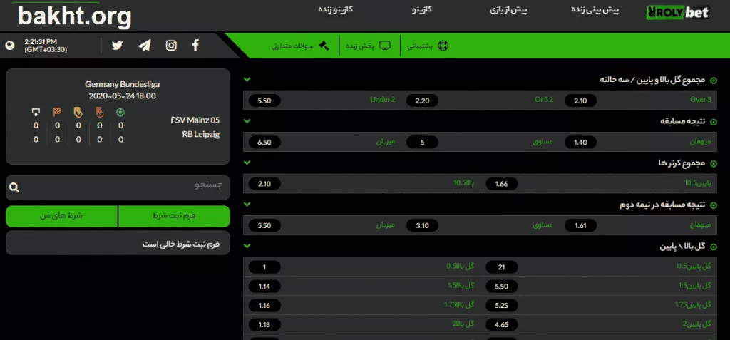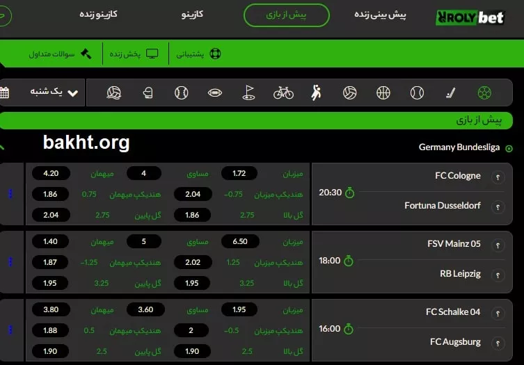 شرط بندی ورزشی در رولی بت به این صورت است. امروز مسابقات بوندسلیگا پیگیری میشود که بالای لیست جا گرفته است. امکان پریدن از روی ورزشها و روزها فراهم است. پیش فرض فوتبال و امروز است. امکان خاصی برای شخصی سازی وجود ندارد.