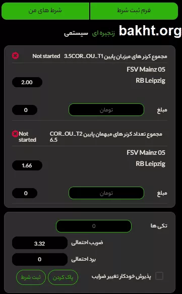 فرم پیش بینی در رولی بت به این صورت است. شرط بندی زنجیره ای و سیستمی تعریف شده است. اجازه میکس شرط بندی از یک مسابقه را ندارید. با این حال میتوانید روی چند آیتم از یک مسابقه، به صورت همزمان سینگل ببندید.